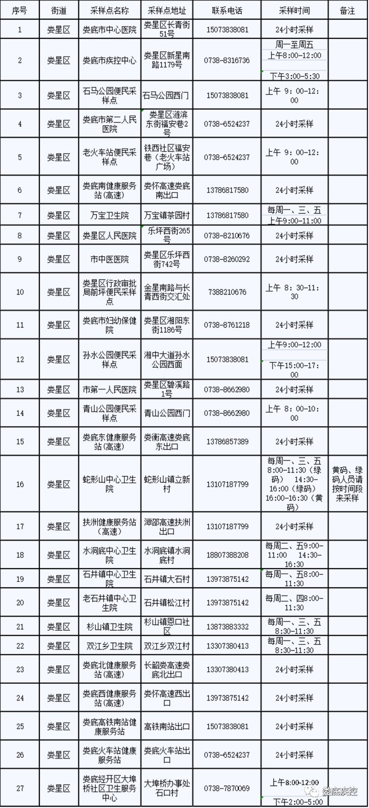婁底市常態(tài)化核酸檢測采樣點信息公布一覽表