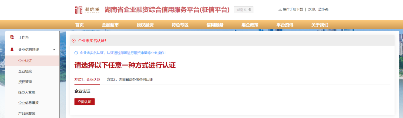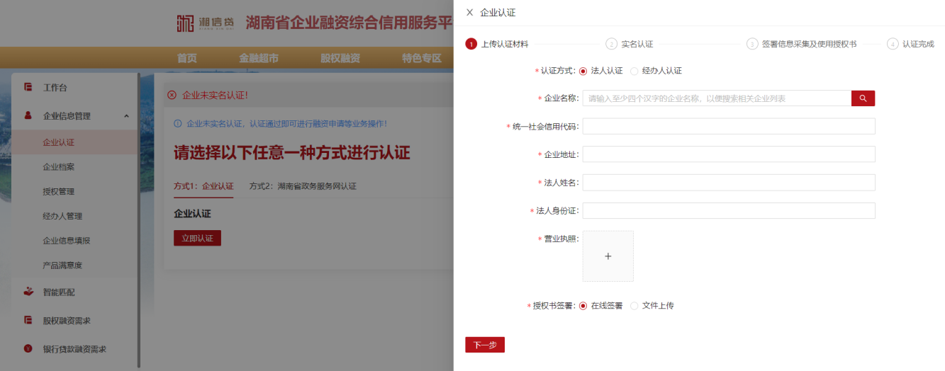 4、在企業(yè)實(shí)名認(rèn)證頁(yè)面,選擇認(rèn)證方式(企業(yè)認(rèn)證:需上傳營(yíng)業(yè)執(zhí)照信息,湖南省政務(wù)服務(wù)網(wǎng)認(rèn)證:需在湖南省政務(wù)服務(wù)網(wǎng)開(kāi)通了賬號(hào)),并按照認(rèn)證流程進(jìn)行操作。