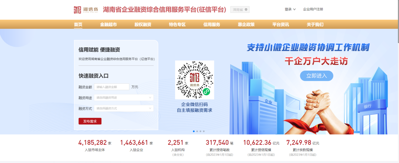 1、電腦瀏覽器輸入“湘信貸”平臺(tái)地址,訪問(wèn)網(wǎng)站首頁(yè),https://credit.fgw.hunan.gov.cn/xyd。