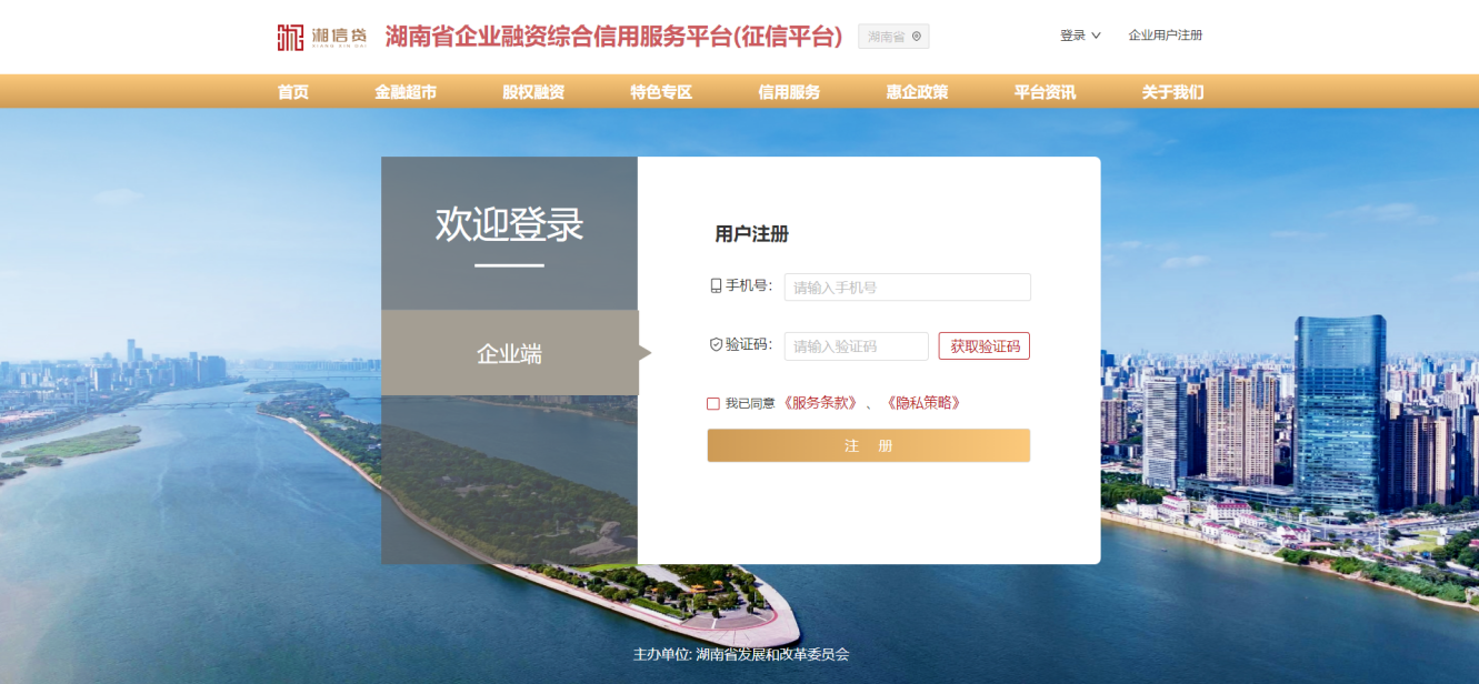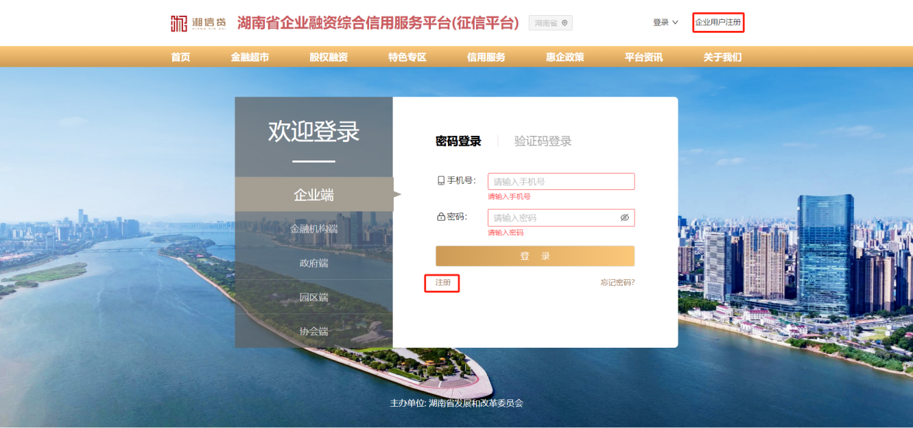 1、在“登錄頁(yè)面”左下角點(diǎn)擊“注冊(cè)”按鈕或在“湘信貸”平臺(tái)網(wǎng)站右上角,點(diǎn)擊“企業(yè)用戶注冊(cè)”按鈕,進(jìn)入注冊(cè)頁(yè)面。