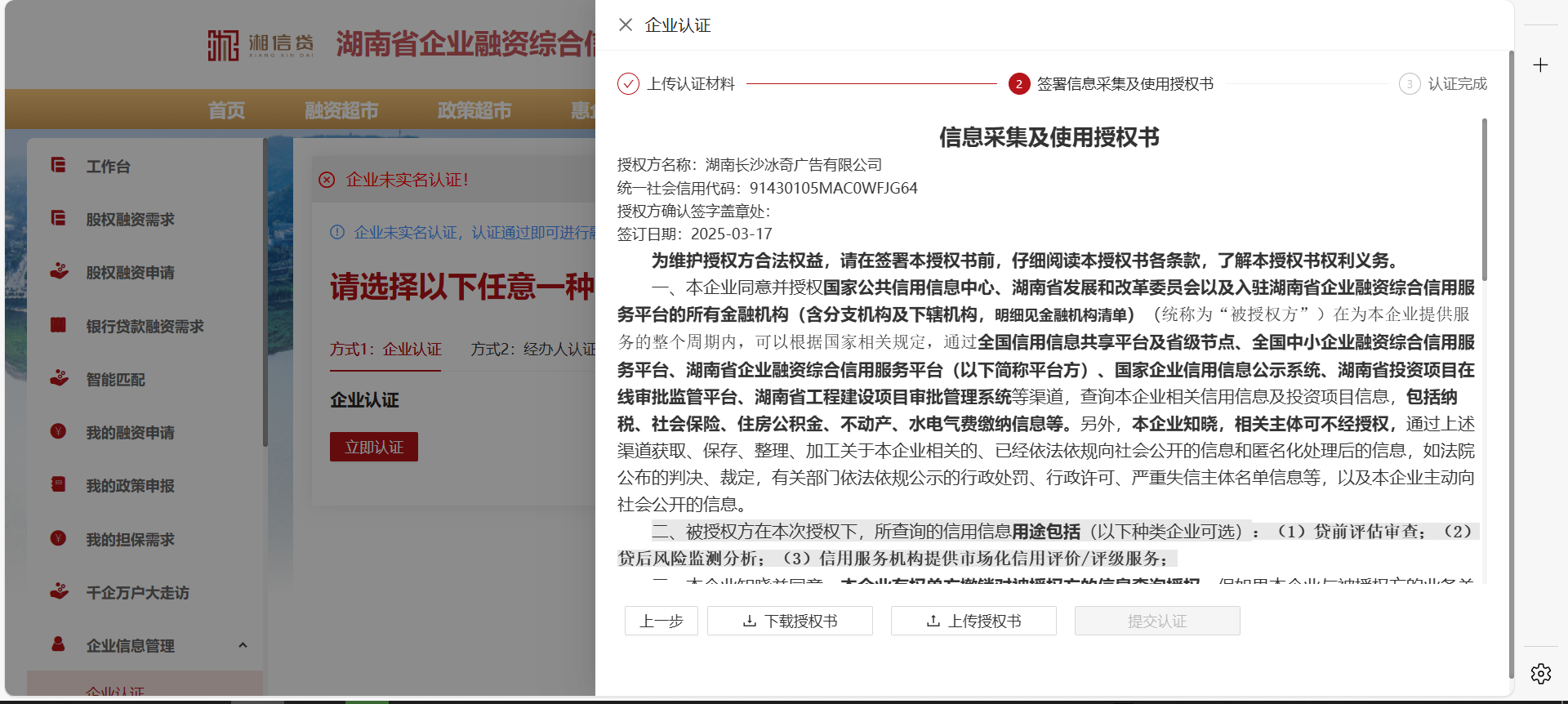 5、在完成企業(yè)認(rèn)證后,進(jìn)行企業(yè)信息采集使用授權(quán)書(shū)簽署上傳,允許平臺(tái)查詢(xún)企業(yè)相關(guān)基礎(chǔ)信息、納稅欠稅、不動(dòng)產(chǎn)、水電氣繳費(fèi)信息情況。