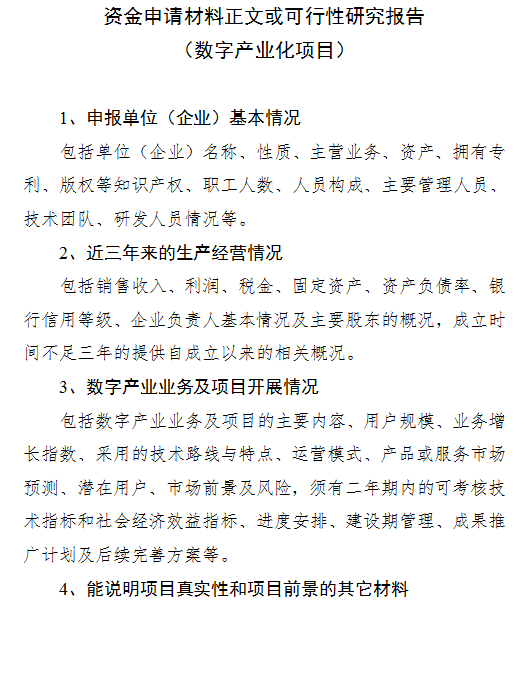 (1)數(shù)字產(chǎn)業(yè)化項目。申報主體為服務(wù)業(yè)企業(yè)的,要求2022年營業(yè)收入應(yīng)在1000萬元以上、且當年稅收在10萬元以上,優(yōu)先支持規(guī)模以上企業(yè);申報主體為制造業(yè)企業(yè)的,應(yīng)為規(guī)模以上工業(yè)企業(yè)、且2022年稅收在100萬元以上企業(yè),優(yōu)先支持具有兩化融合管理體系貫標認證資質(zhì)的企業(yè)。